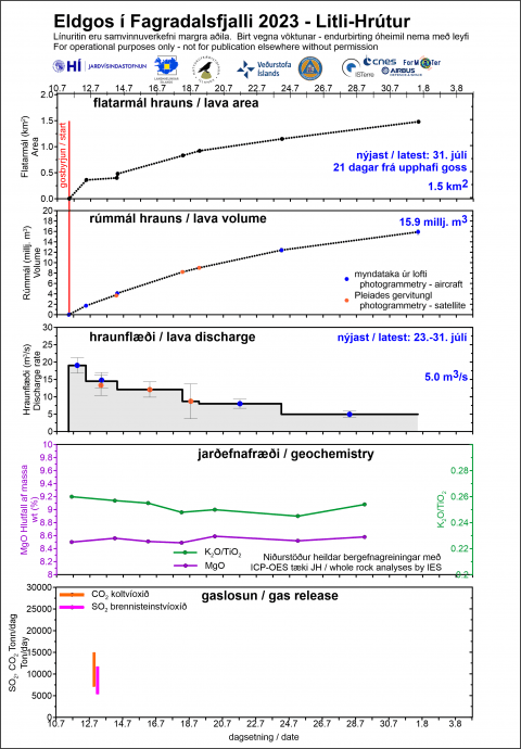 Efnagreind hafa verið sýni frá fjórum dögum til viðbótar við fyrri mælingar sem birtar hafa verið hér á síðunni (17., 19., 24. og 28 júlí). Engar marktækar breytingar hafa orðið á efnasamsetningu hraunsins frá því gos hófst við Litla Hrút 10. júlí. Hraunkvikan líkist mjög þeirri bráð sem gaus í Meradölum í fyrra en er ólík þeirri sem kom upp fyrstu mánuðina í Geldingadölum 2021.