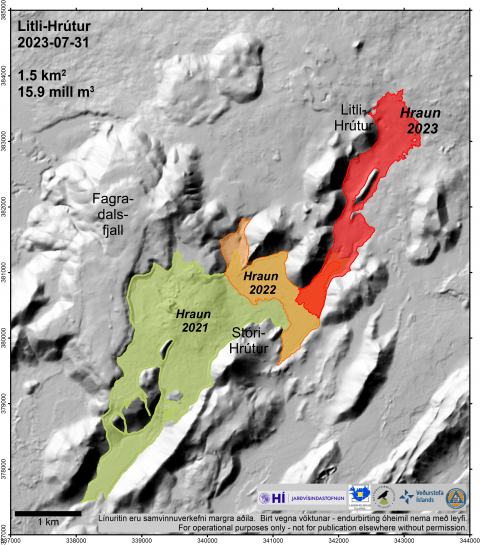 Hraunið var orðið 1,5 km2 og rúmmál þess 15,9 milljón rúmmetrar. Stækkun hraunsins síðustu viku var ekki mikil, en þó einkum austan til auk þess sem jaðarinn gekk fram um 200-300 m í Meradölum. Gosið nú er orðið nokkru stærra en það sem varð í ágúst í fyrra, en í samanburði við gosið 2021, er þetta hraun ennþá aðeins rúmlega 10% af því sem kom upp þá.