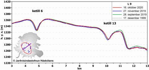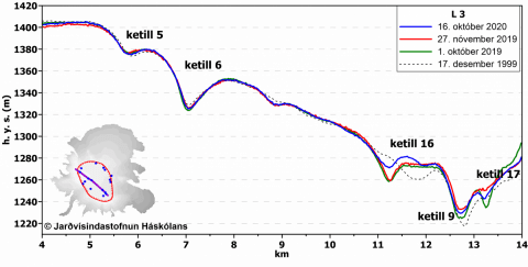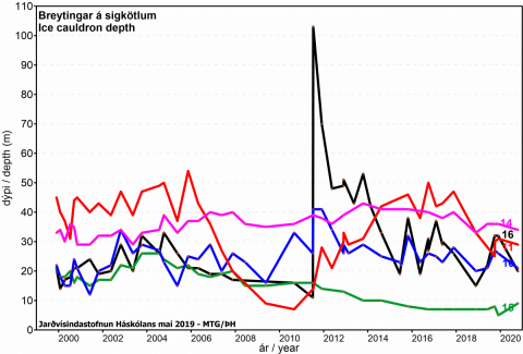 Niðurstöður úr 3 síðustu mælingum og ferð 17. desember 1999 eru á meðfylgjandi myndum. Yfirborðshæðin lækkar um 4-10 m frá vori til hausts vegna leysingar en hækkar aftur yfir veturinn vegna snjósöfnunar. Fyrir utan hina árstíðabundnu sveiflu má greina þrjú tímabil í mælingunum. Frá haustinu 1999 fram á mitt ár 2001 grynnkaði ketill 7 en að öðru leiti voru breytingar litlar. Frá miðju ári 2001 fram á árið 2004 dýpkuðu nokkrir sigkatlanna vegna aukins jarðhita. Þessi þróun hélst í hendur við landris og aukna skjálftavirkni (www.vedur.is) og tengist líklega aukinni kvikusöfnun undir kötluöskjunni. Eftir 2004 dró úr jarðhita á ný þar til í júlí 2011. Skyndileg aukin jarðhitavirkni í suðuausturhluta öskjunnar kom af stað hlaupi í Múlakvísl 9. júlí. Auk augsýnilegra merkja um dýpkun katla 16 og 9 sýna mælingar einnig dýpkun í kötlum 8 og 10. Eftir 2011 hafa orðið nokkrar breytingar en þó ekki stórvægilegar. Ketill 11 dýpkaði aftur eftir að hafa nánast horfið á árunum 2008-2011 og ketill 16 hefur grynnst. Nýir, litlir katlar hafa skotið upp kollinum. Ketill 18 sást fyrst 2011 og ketill 20 nokkrum árum síðar.